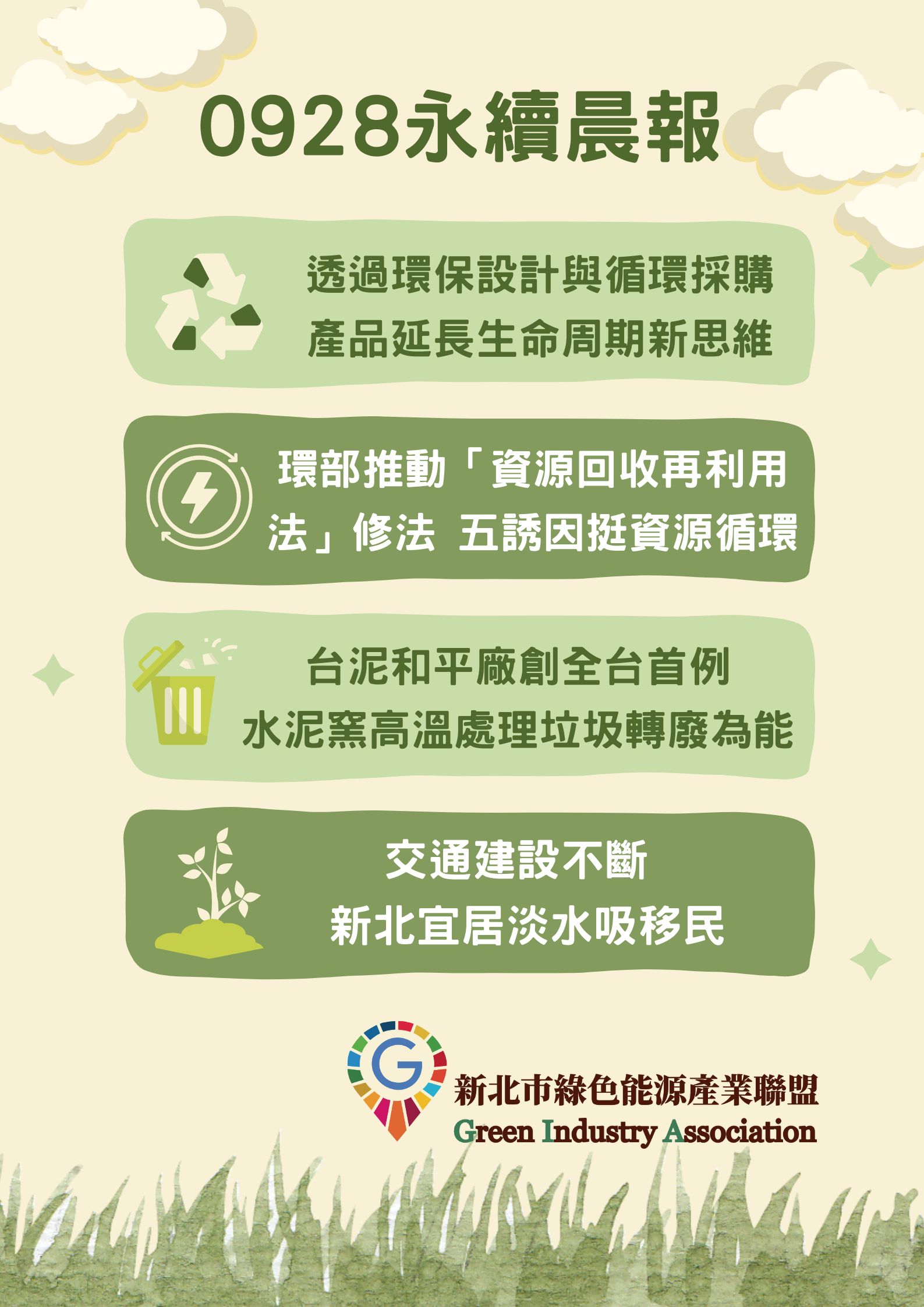 經濟:為邁向2050淨零排放及零廢棄之永續願景,環境部提出「資源回收再利用法」修正草案,研擬更名為「資源循環推動法」,祭出五大誘因,其中「循環實驗沙盒」更接軌國際,讓業者在實驗期間得免取得相關許可,降低相關實驗障礙。歐盟在2020年公布「新循環經濟行動計畫」,明確表示循環經濟應跳脫傳統廢棄物管理思維,倡議需建立永續產品政策框架,在設計階段將產品永續性、可循環性要素納入考量。為與國際接軌及兼顧永續發展需求,這次「資源循環推動法」修法重要內容之一,就是大幅增加輔導獎勵措施,推動政府優先採購循環產品以創造循環供應鏈,更扶植循環產業,也就是設置獎補助、融資與保證機制,並協助提供資源循環用地解決土地取得困難,同時也設「循環實驗沙盒」鼓勵創新。除了原本的獎勵開發再生技術,環境部也針對綠色設計、源頭減量及永續消費相關技術開發、人才培訓、實際運用執行與管理績效優良者,如機關、事業、學校、團體或個人給予獎補助。